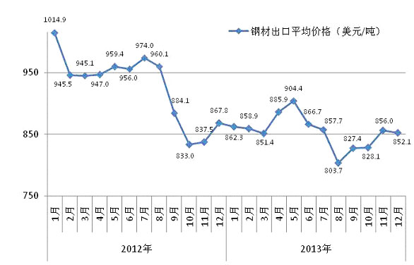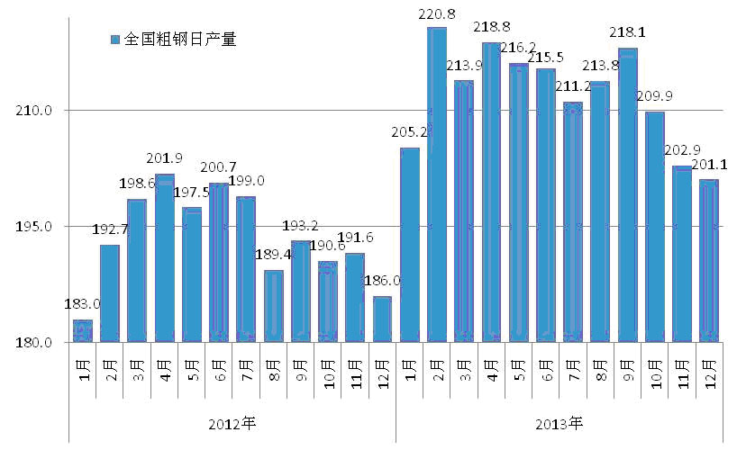 从全年走势看,在前三个季度,北美、欧洲和亚洲的钢价走势基本相同,但第四季度出现差异,其中欧洲和亚洲钢价走势趋于平稳,而北美则呈现出较明显的上升走势。 (3)我国出口钢材价格呈波动下行走势 2013年,我国钢材出口平均价格为854美元/吨,比上年下降70美元/吨,降幅为7.6%。从分月情况看,1-5月份出口钢材价格总体呈小幅上升走势,6-8月份明显下降,9-12月份有所回升。(见下图) 我国出口钢材平均价格走势图 从分品种情况看,长材出口价格跌幅最大,全年平均出口价格为608美元/吨,同比下降81美元/吨,降幅为11.8%;板材和管材出口价格降幅相对较小,全年平均价格分别为807美元/吨和1191美元/吨,分别比上年下降2.6%和2.8%;铁道用材出口平均价格为1011美元/吨,比上年上升51美元/吨,升幅为5.3%。 二、国内市场钢材价格走势分析 2013年,受钢铁需求增速放缓、钢铁产能较快释放等因素的影响,国内市场供大于求矛盾更加突出,钢材价格总体上呈波动下行走势。 1、主要用钢行业增速回落,钢材需求增长放缓 据国家统计局数据,2013年国内生产总值增长7.7%,增速与上年持平。从近年情况看,2010年增长10.4%,2011年增长9.3%,2012年增长7.7%,经济增长呈回落趋势。从投资、消费和净出口对GDP增长贡献看,资本形成总额贡献率是54.4%,比上年提高4.0个百分点;消费的贡献率是50.0%,比上年下降1.8个百分点;净出口贡献率是-4.4%。投资和消费是拉动经济增长的主要动力,但投资和消费的增长速度均有所下降,且投资贡献率再度超过消费,显示需求增长出现回落。2013年,全国固定资产投资(不含农户)同比增长19.6%,增速比上年回落1.0个百分点。其中制造业和房地产业投资分别增长18.5%和20.3%,分别比上年回落1.5和1.8个百分点;规模以上工业增加值增长9.7%,比上年回落0.3个百分点;消费增长11.5%,比上年回落0.6个百分点;全国货物运输总量增长9.9%,比上年回落1.6个百分点。从总体情况看,受下游用钢行业增速回落影响,钢材需求增长有所放缓。 2、钢铁产量再创新高,加剧了市场供需矛盾 为遏制钢铁产能盲目扩张,清理整顿违规产能,淘汰和退出落后产能,调整和优化钢铁产业结构,国务院在2013年10月下发了《关于化解产能严重过剩矛盾的指导意见》,明确提出对钢铁行业将通过强化环保、安全等标准的硬约束措施,综合运用法律法规、产业政策、节能减排、安全生产、环保监管等手段化解产能严重过剩矛盾。据国家统计局数字,2013年,钢铁行业固定资产投资6726亿元,同比增长0.7%,其中黑色冶炼及压延业投资5060亿元,同比下降2.1%,显示国家严控产能过剩行业投资项目初步取得成果。但由于基数庞大,新增产能仍然较多,据工信部2014年2月发布的《2013年钢铁工业经济运行情况》报告中指出,2013年全国粗钢产能又增加了约4000万吨;全国生铁、粗钢和钢材(含重复材)累计为产量分别为70897万吨、77904万吨和106762万吨,分别同比增长6.2%、7.5%和11.4%,分别比上年增速提高2.5、4.4和3.7个百分点;平均日产粗钢达到创纪录的213.43万吨。钢材市场严重供大于求,是钢材价格低位运行的主要原因。(见下图) 全国粗钢日产量变化情况图 3、钢材出口保持增长,但对缓解国内供需矛盾作用不大 据海关统计,2013年,全国累计出口钢材6234万吨,同比增长11.9%。进口钢材1408万吨,同比增长3.1%。净出口钢材4826万吨,比上年增加619万吨,增长14.7%。从出口钢材品种结构看,板材出口量为2764万吨,占全部钢材出口量的比重为44.3%,比上年多出口68万吨,仅增长2.5%;而长材出口量为2121万吨,占比为34.0%,比上年多出口611万吨,比上年大幅增长了40.5%。但如果剔除“合金棒线材”和“合金型材”后,长材出口量仅为114万吨,比上年下降了5.7%。从总体来看,钢材出口对缓解国内供需矛盾作用不大。 4、铁矿石价格基本保持平稳,其他原燃材料价格明显下降 在钢铁产量保持强劲增长的拉动下,铁矿石价格保持坚挺。2013年,进口铁矿石(海关)平均价格为129.03美元/吨,同比上升0.28美元/吨,比上年上升0.22%;进口铁矿石港口现货平均价格为960元/吨,比上年下降2.5%;国产铁精粉平均价格为986元/吨,上升1.54%。相对于铁矿石价格的高位坚挺,炼焦煤、冶金焦、废钢、炼钢生铁和钢坯价格水平则有较明显的回落,平均价格分别比上年下降了242元/吨、276元/吨、401元/吨、338元/吨和316元/吨,降幅分别为16.84%、16.61%、13.50%、9.71%和10.30%。原燃材料价格的回落,使钢铁生产成本对钢价的支撑作用有所减弱。(见下表) 钢铁生产用主要原燃材料市场价格变化情况表