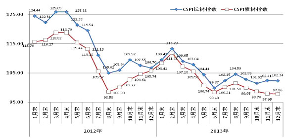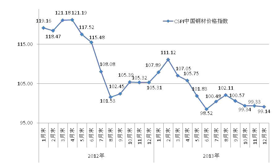 2013年,我国经济保持平稳较快发展,钢材需求继续有所增长。但由于经济增长面临较大下行压力,用钢行业增速回落,再加上钢铁产能较快释放,钢材市场供大于求态势有所加剧,钢材价格呈波动下行走势,总体水平低于上年。 一、全年钢材价格走势情况 1、国内市场钢材价格渐失弹性,总体水平低于上年 2013年,国内市场钢材价格呈波动下行走势,而且由于长时间低位运行而逐渐失去弹性,虽价格起伏幅度较小,但总体水平低于上年。CSPI中国钢材价格指数全年最高点是2月末的111.12点,最低点是6月末的98.52点,降幅为11.34%,比上年最大价格落差低4.88个百分点。但全年平均指数仅为102.76点,比上年下降9.00点,降幅为8.05%。(见下表) CSPI中国钢材价格指数变化情况表