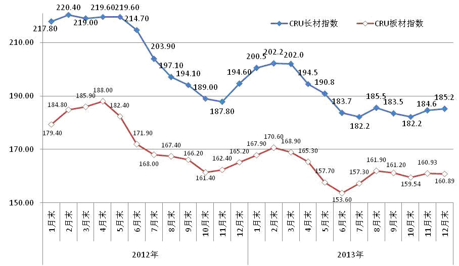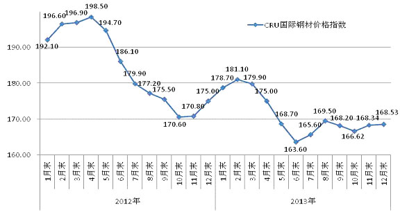 2、国际市场钢材价格上半年大幅波动,下半年趋于平稳 2013年,国际市场钢材价格在上半年大幅波动,而下半年则呈现平稳走势。全年最高点是2月末的181.1点,最低点是6月末的163.6点,价格指数落差为17.5点,降幅达9.7%;而下半年最高点是8月末的169.5点,最低点是7月末的165.6点,波动幅度仅为3.9点,明显小于上半年。全年CRU国际钢材价格平均指数为171.2点,比上年下降13.3点,降幅为7.2%。(见下图) CRU国际钢材价格指数走势图 CRU国际市场钢材价格全年走势大致可分为五个运行区间,即1-2月小幅上升、3-6月跌幅下降、7-8月小幅回升、9-10月小幅下降和11-12月小幅回升。 (1)国际市场长材价格降幅高于板材 2013年,CRU长材价格平均指数为189.7点,比上年下降16.8点,降幅为8.1%;板材价格平均指数为162.2点,比上年下降11.4点,降幅为6.6%;长材价格降幅比板材高1.5个百分点。(见下表、下图) CRU国际钢材价格指数变化情况表