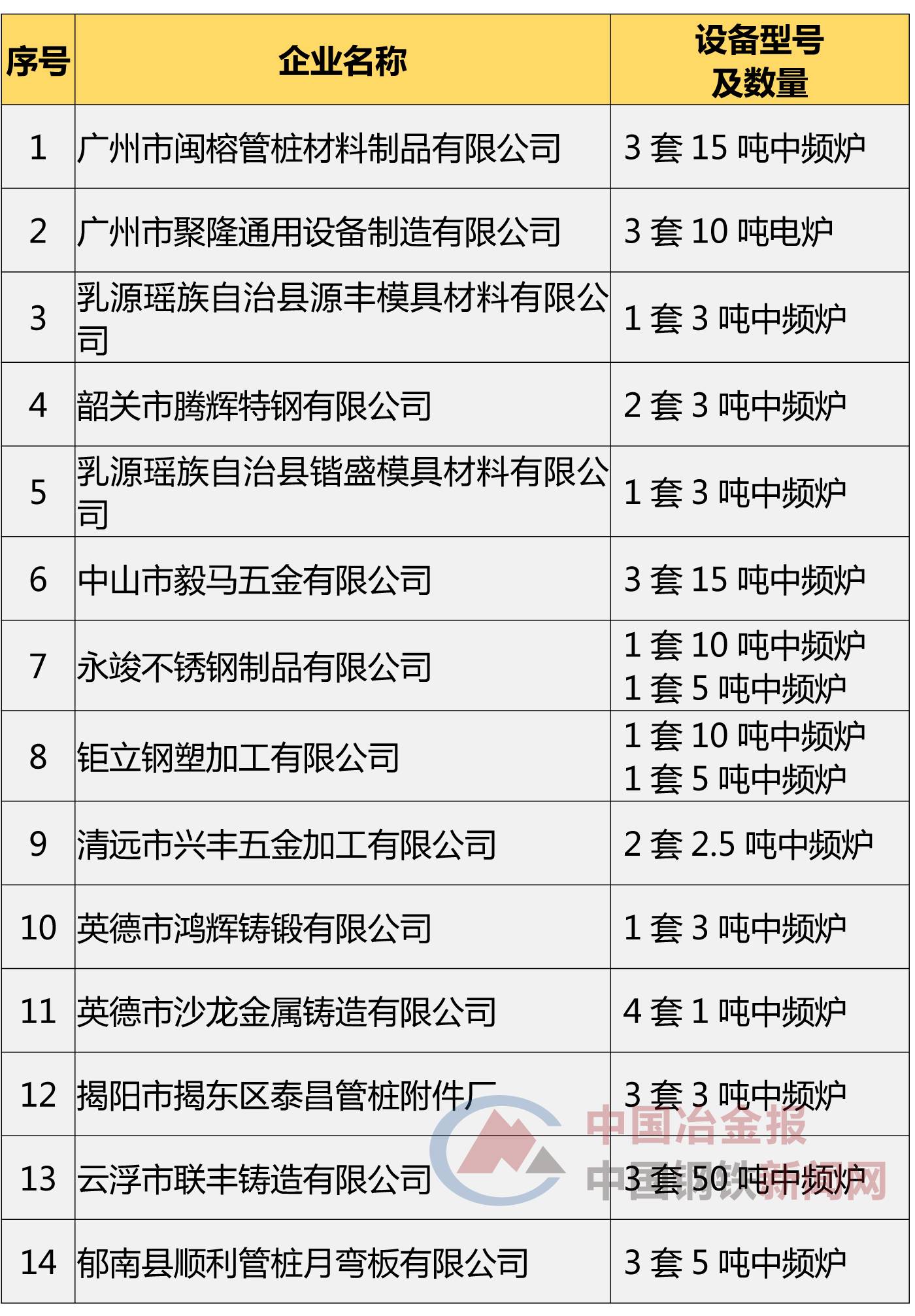 同时,陕西省还拆除了西安益鹏金属材料有限公司、宝鸡市民盛型材有限公司、宝鸡给力机械制造有限公司3户企业的落后设备。 ![]() 近日,广东省发改委发布《关于广东省钢铁行业淘汰落后产能企业名单(第四批)的公示》(以下简称“《公示》”),包括广州市闽榕管桩材料制品有限公司在内的14家具有中(工)频设备的企业在列,此次合计拆除中频炉32座。《中国冶金报》、中国钢铁新闻网小编整理如下——