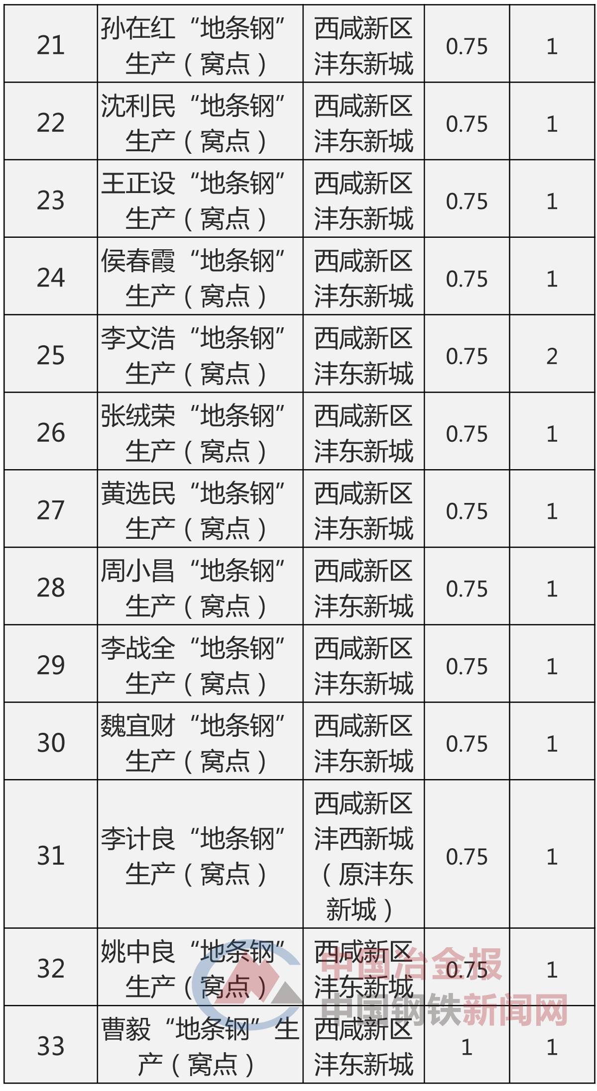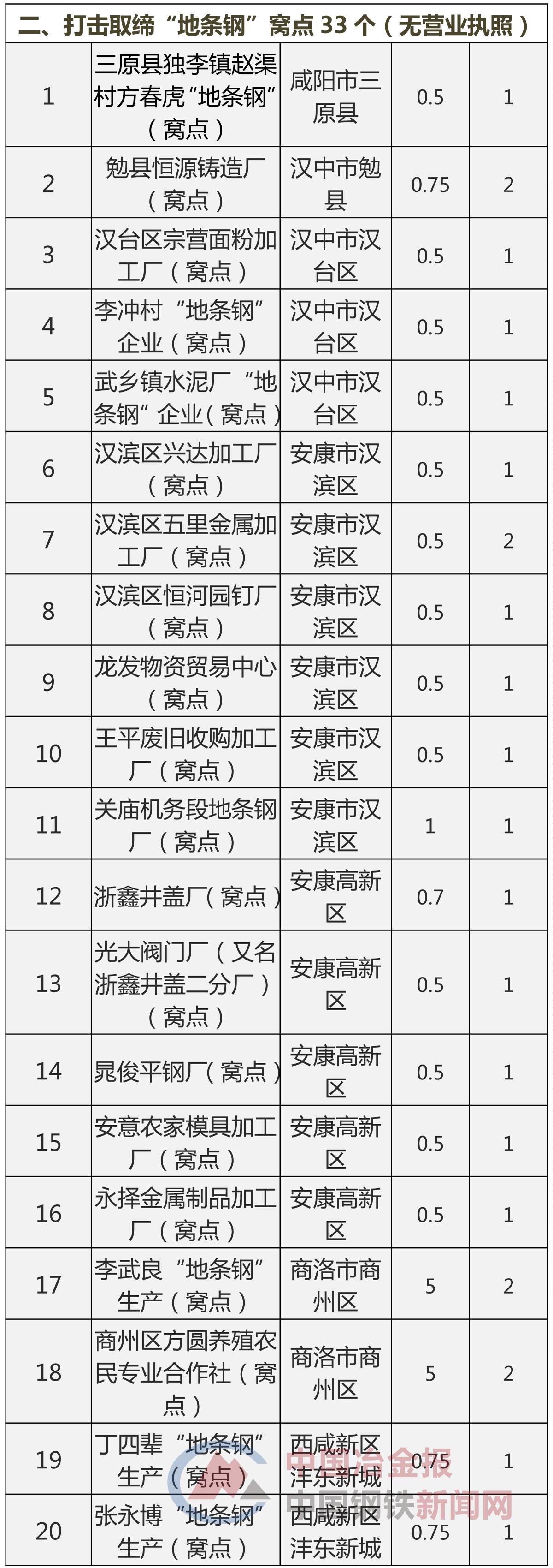 近日,陕西省政府发布《2017年陕西省打击取缔“地条钢”情况公示》称,截止6月底,全省共打击“地条钢”企业18户、取缔“地条钢”窝点33个,涉及中(工)频炉125台,并按照“四个彻底”要求,拆除了中(工)频炉主体设备、变压器、除尘罩、操作平台及轨道等设备设施,违法违规产能已全部退出。《中国冶金报》、中国钢铁新闻网小编将具体拆除取缔情况整理如下表示——